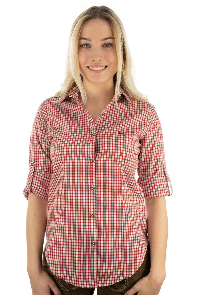 Designul său cu carouri alb rosu adaugă un aer autentic, specific costumelor tradiționale alpine. Detaliile precum nasturii aspect corn de pe manșete, fenta cu nasturi și prinderile de pe mâneci aduc un plus de stil. Mâneca lungă poate fi rulatǎ și prinsă lejer cu lăcățelele incluse. Deasupra pieptului se regăsește o broderie fină cu un cerb, simbol tradițional al eleganței rustice.