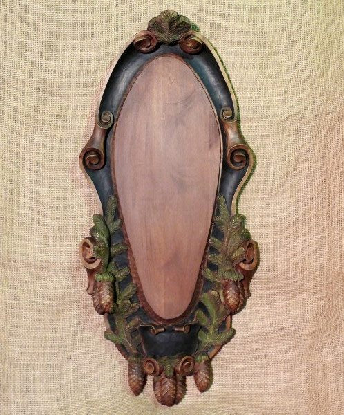 Panoplie lucrata manual decorativă realizată din lemn, destinată montării trofeelor de cerb (în special craniu cu coarne). Are o formă alungită, ovală, cu o bordură sculptată în stil rustic. Ornamentația prezintă conuri de brad, frunze de stejar și motive vegetale sculptate în relief, colorate în nuanțe naturale de verde și maro, care completează estetica montană. Marginile sunt evidențiate cu volute decorative, iar partea centrală, netedă și simplă, este lăsată liberă pentru fixarea trofeului. Întregul ansamblu are un aspect tradițional, specific decorurilor de vânătoare, fiind potrivit pentru o cabană, un foișor sau un interior amenajat în stil rustic.