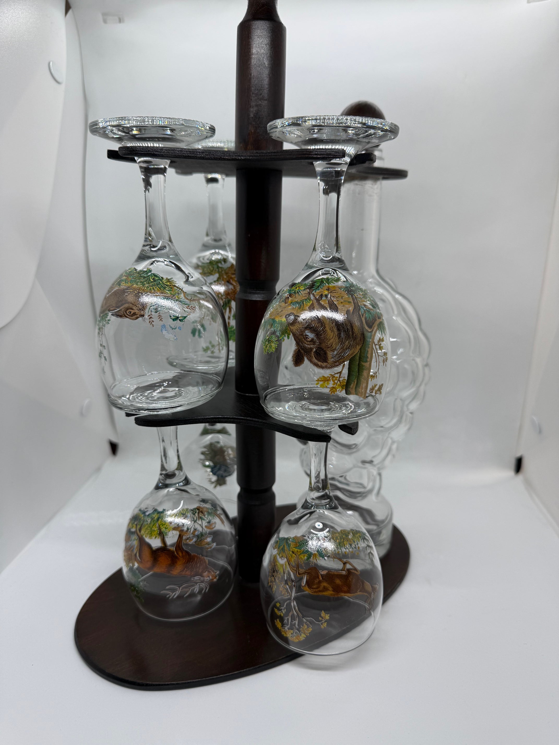 Un suport din lemn închis la culoare, destinat susținerii sticlei în centru și a celor 6 pahare suspendate cu gura în jos în jurul acesteia.