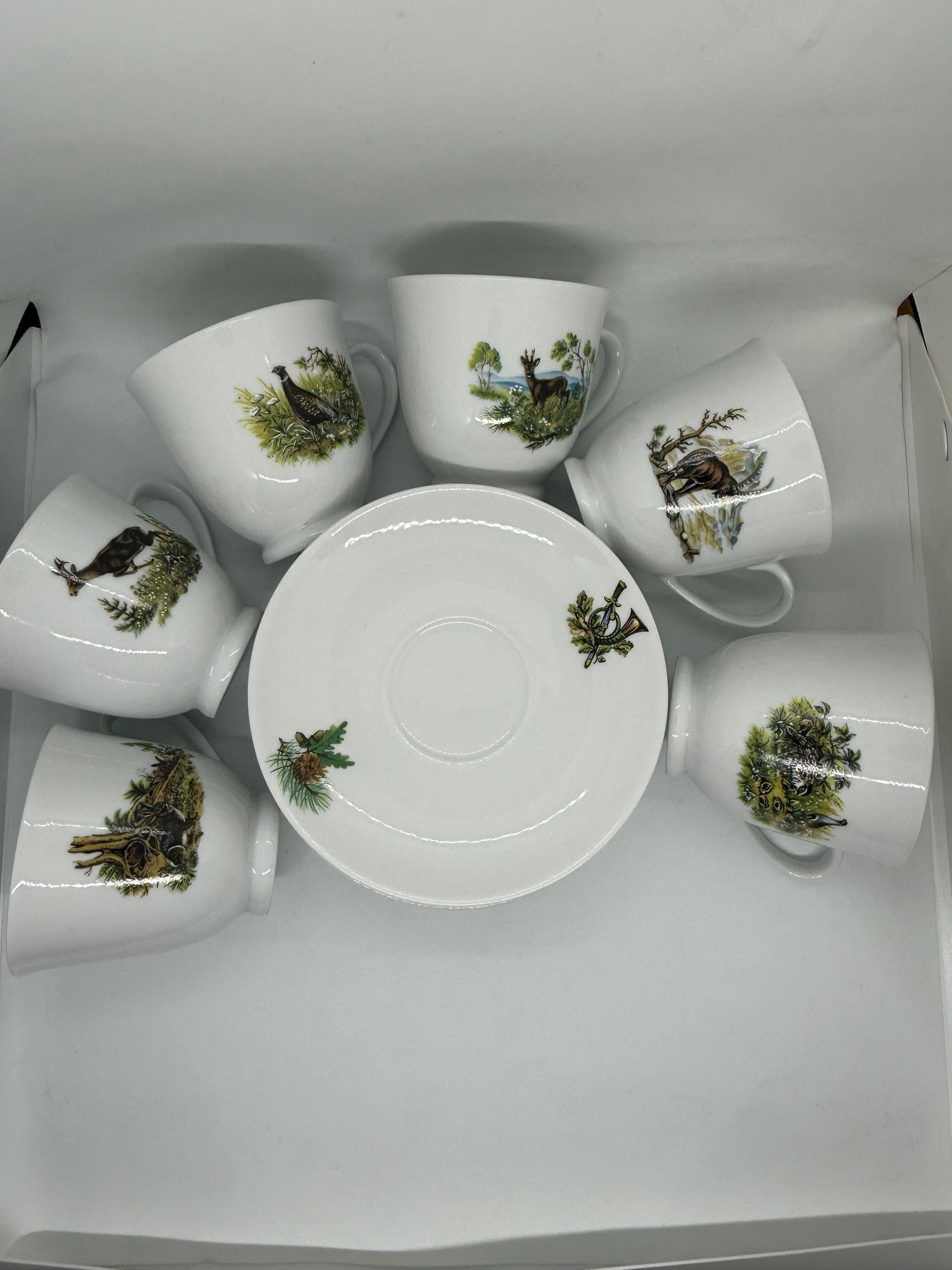 Set portelan format din 6 cesti cu 6 farfurii frumos decorate cu scene din natura