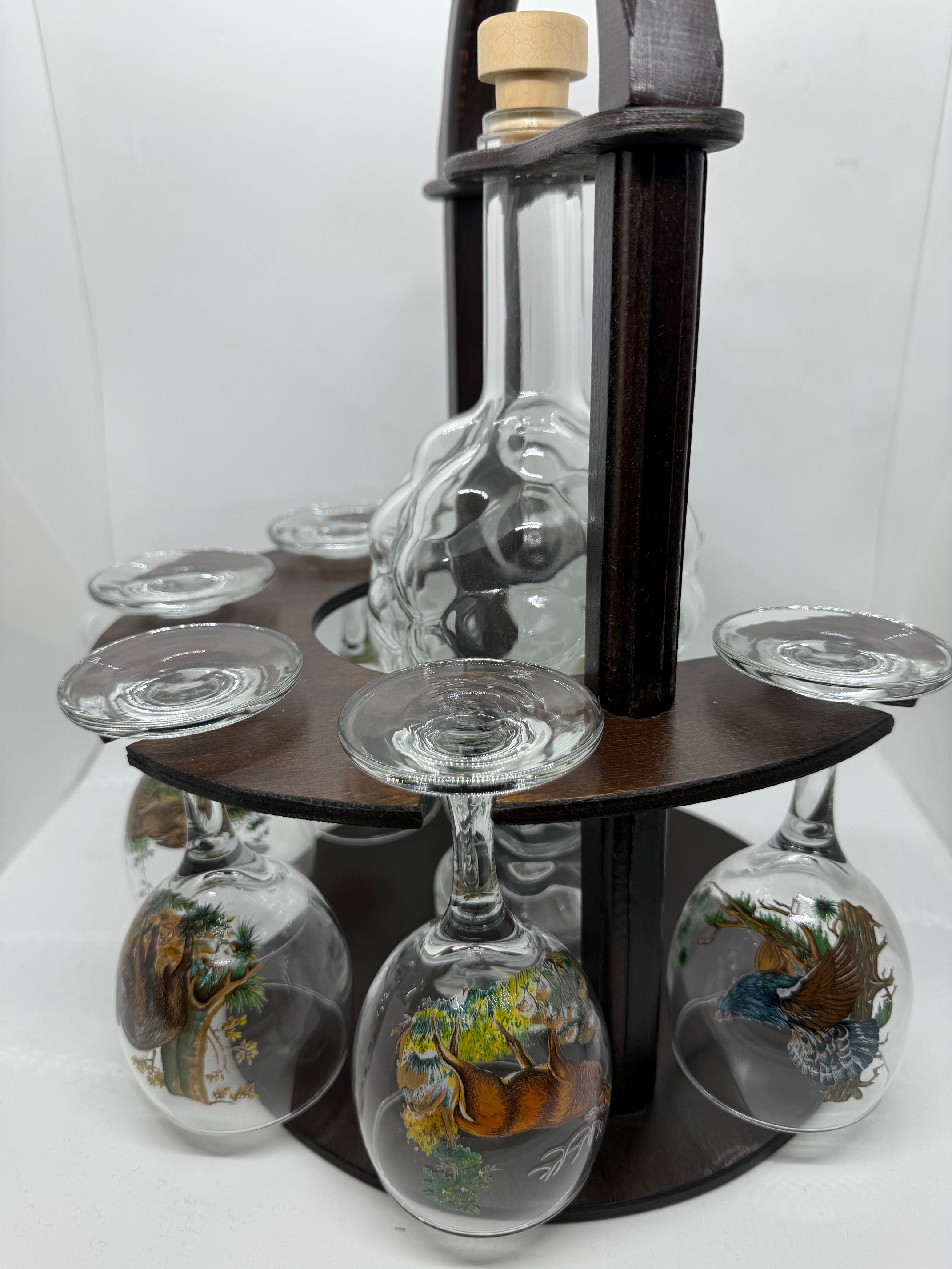 Set sticla cu 6 pahare frumos decorate cu motive de vanatoare, compus din: